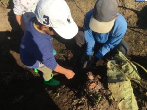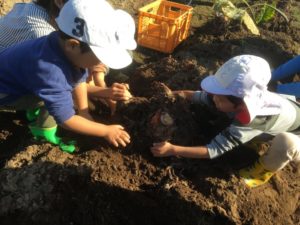 2人一組になり、力を合わせて掘りました。