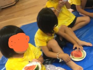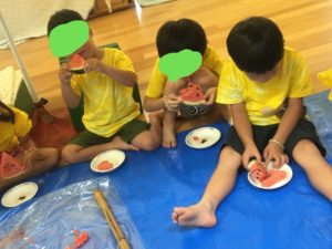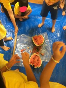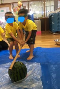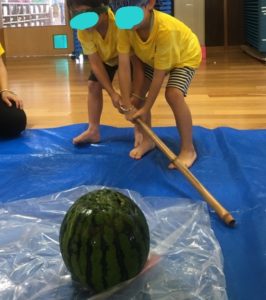 えいっ!とお友達と力を合わせてすいかを割りました!