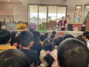 大きな紙芝居のお話しでしたよ!しりとりのお話にお野菜のお話し。どれも楽しいお話しでこどもたちも聞き入っているようでした。