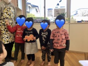 グループごとに違う仕方で作りました。今日は同じ机のお友達がチームだよ!と伝えると、お友達と顔を見合わせながら「チームだって!」「チームって何?」と色んな声が・・・