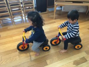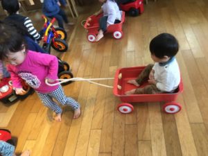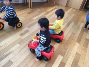今日は風が強くお外遊びをお休みして、ランチルームで室内カーと室内バイク、トロッコで遊びました🚗