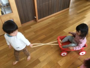 お友達をトロッコに乗せて「出発進行‼️」みんなで変わりばんこに引っ張っていました☺️