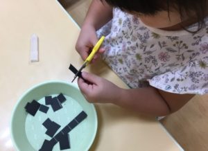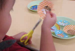 年長グループさんはお弁当でよく見るおかずカップをチョキチョキ✂