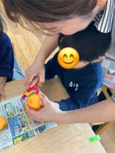 前日に園長先生から甘い柿と、渋柿の見分け方を教えてもらい、それを覚えていた子ども達。