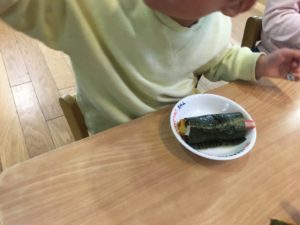 にじぐみ、かぜぐみ、ほしぐみのお友達は自分で恵方巻きの具材を巻いています♪