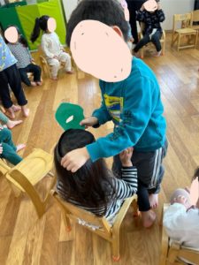 そら組さんにお面をつけてあげています!