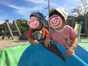 滑り台の上からお友達を見てニコニコと笑っています(*’▽’*)
