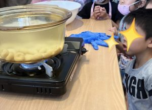 上に浮かんできたら、出来上がりの合図だということがわかり、目が離せない様子でした👀