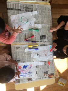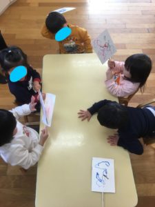 完成した凧は、お天気がいい日に遊ぼうねと、お友達も楽しみにしています!