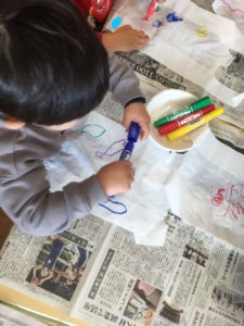 「お家にもあるよ!」と指差していたビニール袋に、油性ペンで絵を描きます。