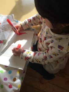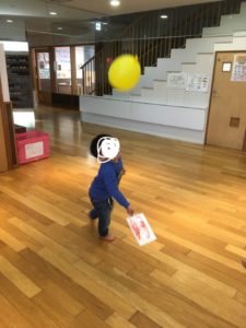 自分たちでお絵描きして作った羽子板です。風船を羽に見立ててしました。保育者や友達としたり、1人でしてみたり、、
