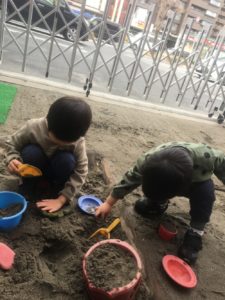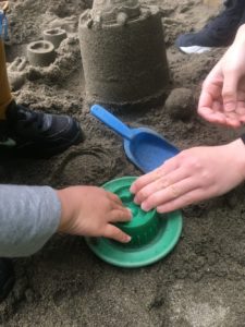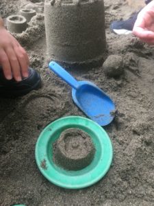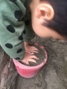バケツいっぱいの砂に、力を込めてぎゅーっと!!