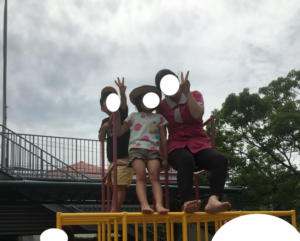 保育者と一緒にジャングルジムの上でハイ、チーズ✌