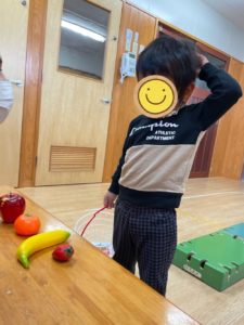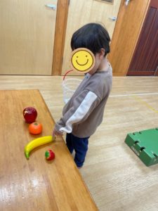 言葉で「みかんください」等伝えられるお友達は言葉で伝え、まだ難しさのあるお友達は指差しなどのジェスチャーで欲しい果物を伝えていました🍌