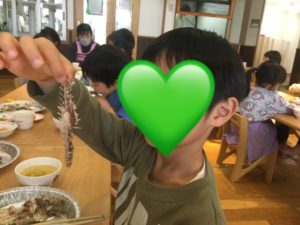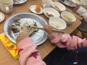 竹箸を使って食べていきました!食べる前にはしっかり魚の目を見て「お魚さん、ありがとう!」と伝えてから食べていきます。