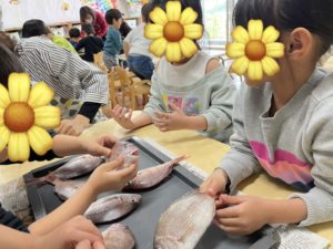 「お魚が何て言ってるか声を聞いてみよう」「海のいい香りがする」「口が赤くてお化粧してるみたい」「まくらみたいに柔らかいお腹だ」