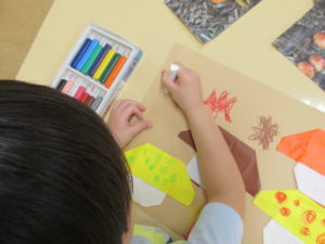 画用紙に貼ったあとに【秋】をイメージたお絵描きをしました。