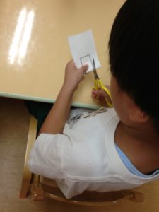 はさみの正しい持ち方を確認しながら切る子どもたち。
