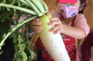 育てていた大根さんの絵を先日描いてみると、子どもたちの観察力が驚くほど成長していて感動しました。すると、園長先生から大潟屋さんの大根さんのプレゼントが!!