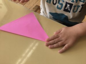 なので、今日はチューリップの折り紙をしました。三角に折って、、