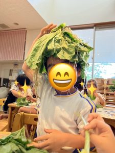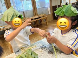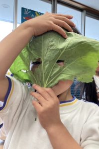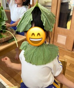葉っぱが大きかったので、葉っぱ帽子をかぶりながら皮をむいたり・・・