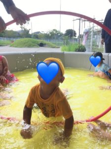 そら組さんの『夏☀️』をご紹介します。今日はそら組では最後のプールでした!今まで、フラフープをワニ歩きでくぐったり、ビート板で浮かんでみたり、顔を洗ってみたり、、、色々なことをしてきました!