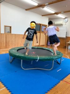 トランポリンでは片足跳びをしたり