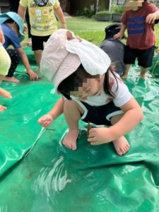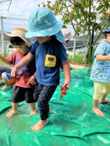 砂場のマットの上に溜まった水に入り