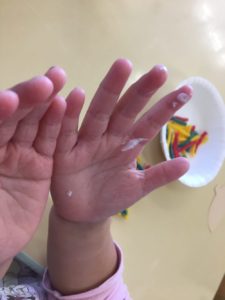 その後は帽子の土台にボンドを保育者が塗り、、その上にさっきの毛糸を付けていきます。ボンドのことを「クリーム♩」と言っているお友達もいましたよ。