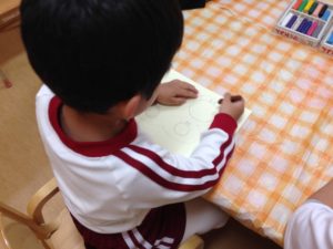 最初に直線や丸の点線をクレヨンでなぞります。