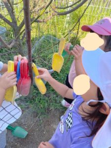 園庭にある木にスコップをかけて