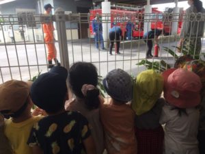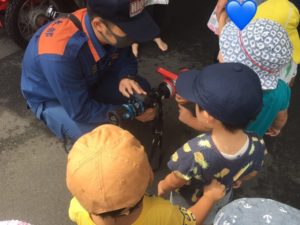 たくさん見学をした後は救助工作車の前でパシャリ!『敬礼!』とポーズも決めていました!クラスに掲示しますのでまた見てみてくださいね(^ω^)