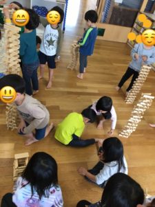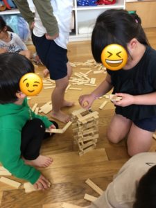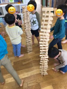 みんなでカプラで遊びました!高ーく積み上げられるのは?ということでみんなで一生懸命積み上げていましたよ。