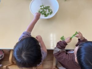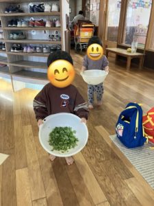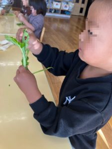 先日は、間引きした葉っぱちぎりをして給食の味噌汁の中に入れてもらいました。