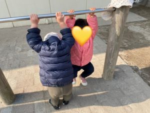 鉄棒でぶら下がるのを見せてくれるお友達も