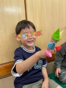 わらべうたに合わせて一つずつ指人形を5本の指につけていきます。人形が増えていくとこども達もとても嬉しそうです☆