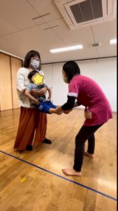 「おやどはどこだ?おやどはどこだ?おやどは…ここだ~!」手の平からどんどん腕の方に進んで行き、最後はこちょこちょとくすぐります。くすぐり遊びは大好き!こども達は、くすぐったーい!と大喜びでした☆
