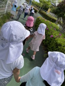 今日のにじ組さんはお散歩にお出かけしました。しっかりとお友達と手を繋いで公園に向かいました。