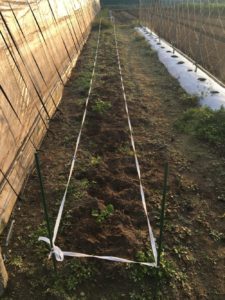ビニールハウスの横でゴボウを育てています。白色のビニール線で囲んでいる中でゴボウが育っています。