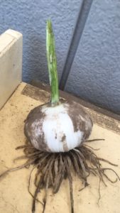 お店で売っているニンニクは、周りの皮を剥いたら、小さ目のニンニクが数個でてくると思いますが、大潟屋で育てているニンニクは1個大きなニンニクがデーン!!!としていますので、周りの皮をむいて小さ目の分割されたニンニクが出てこないんです。