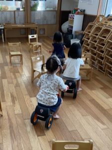 ランチルームで室内カーで遊んだり