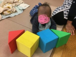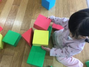 好きな形のブロックを手に取って、並べたり積み重ねたりして遊んでいました。