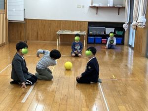 お座り転がしドッジボールで