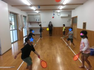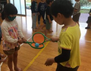まずは、ラケットにボールを乗せて落とさないように運びます。