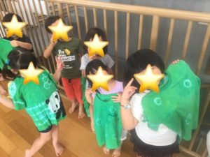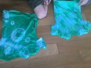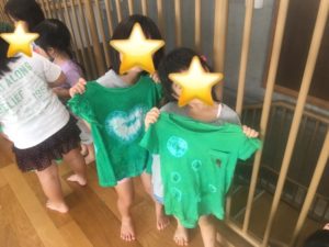 この間、親子で作ってもらった染めTシャツの完成の日でした。みんなでできますように☆と願いながら、緑のなかに入れました。