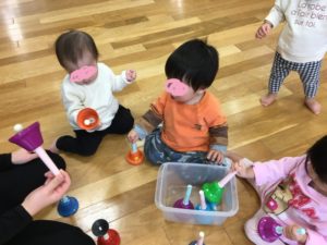 保育者の姿を見て、一緒に楽器を鳴らしていました。