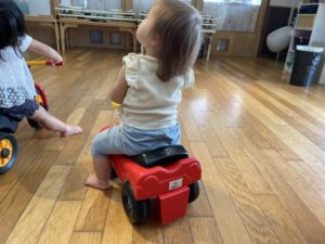 乗り物が大好きなつき組さんは早速お気に入りの乗り物を見つけて跨っていました♪