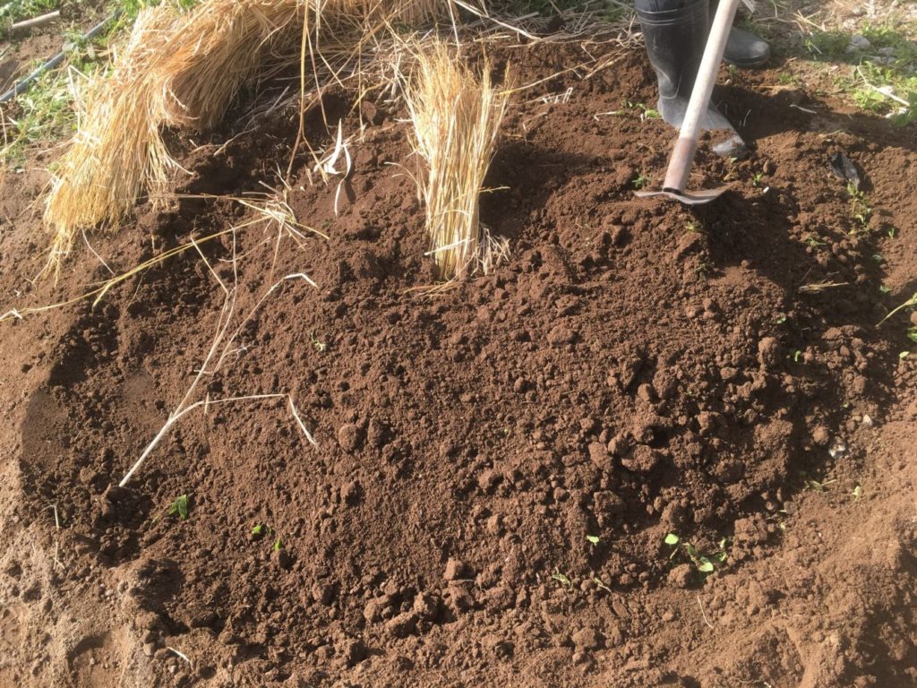ワラを敷いて、(今年取り立てフカフカの藁を引きます)