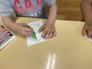 葉っぱを観察して、クレヨンで描いてみました。葉脈まで表現できましたよ!