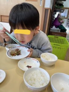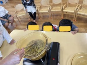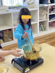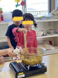 煮ている様子を皆んなで観察しましたが、お鍋の中の様子を机の下から覗いて、「泡が出てるー!」とニコニコ観察している姿もありました😊